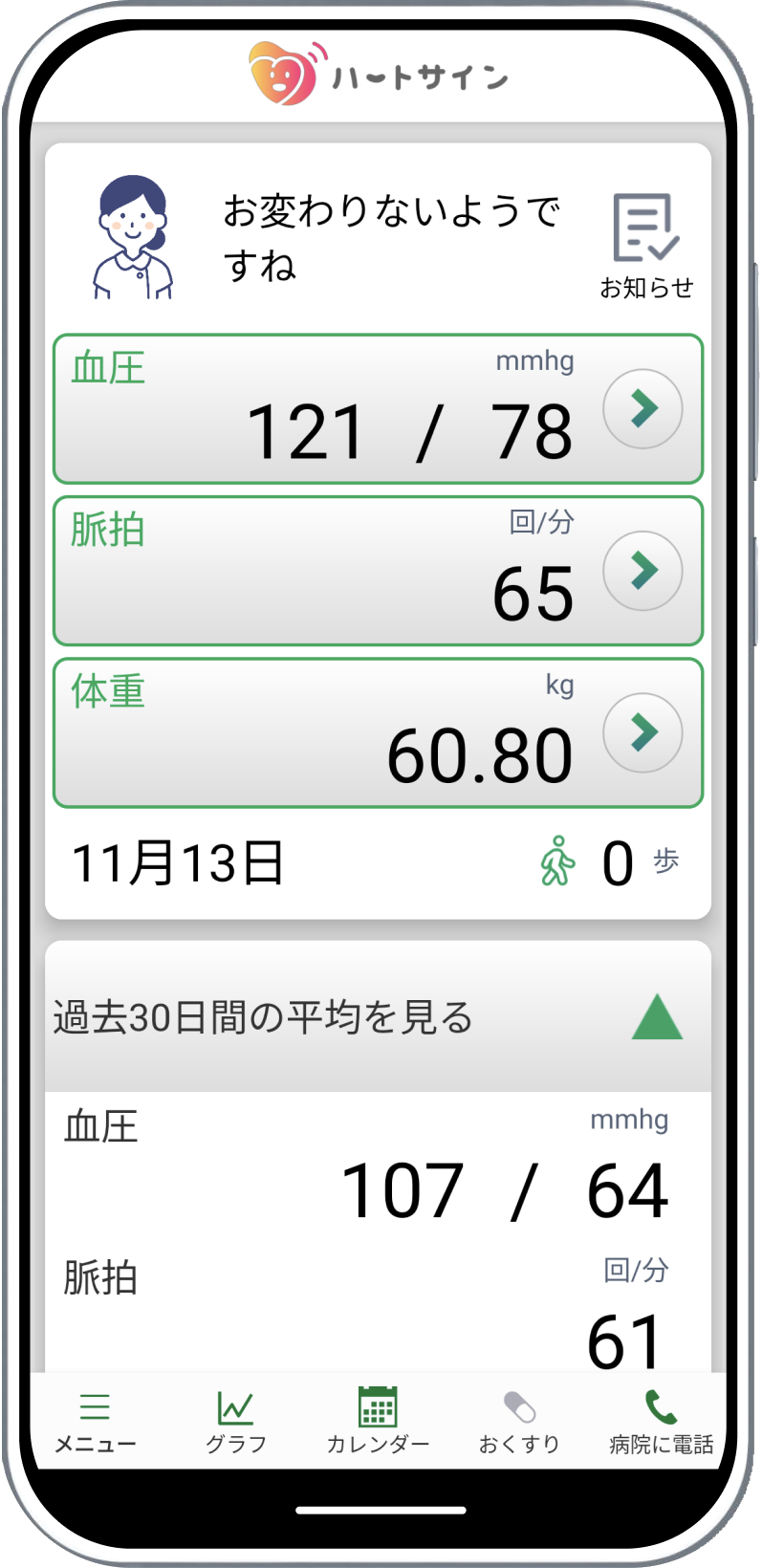 継続した記録により、心不全症状の見逃しや悪化による緊急入院のリスク軽減を目指しています。